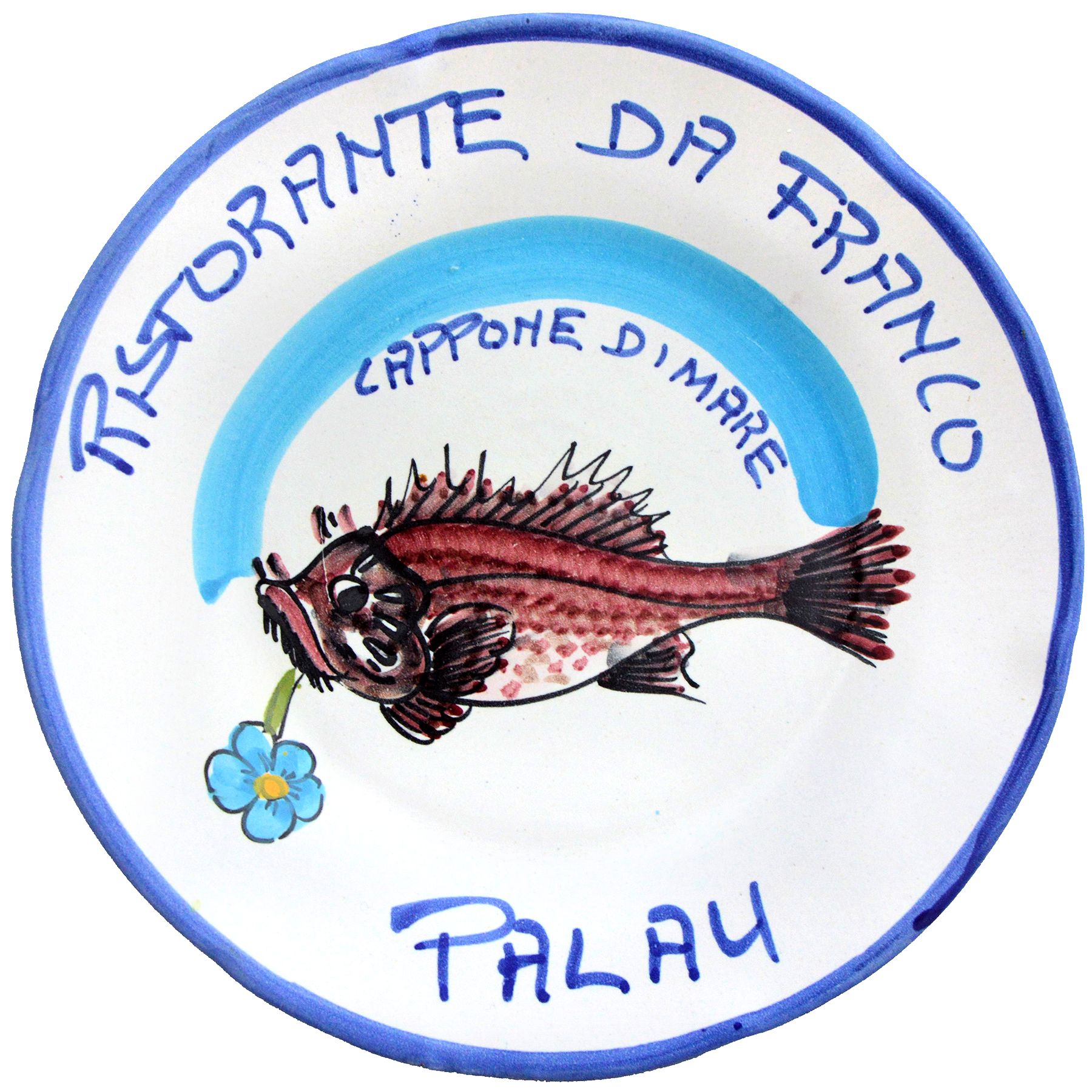 * Brodetto alla Davide mar. 71 - nov. 90 I piatti di presentazione riportano i timbri 6E/6F, hanno il bordo rosso, 15 pesci, il fumetto è di colore blu e i manici di terracotta. Le varianti di questo piatto: > 15 pesci con fumetto nero, manici di terracotta > poi si passa a 13 pesci con fumetto nero, manici in metallo > 1° con bordo verde, 13 pesci, manici in metallo oppure terracotta > 11 pesci (timbro 5F) > 2° con bordo verde, con timbro 11G e meno elaborato