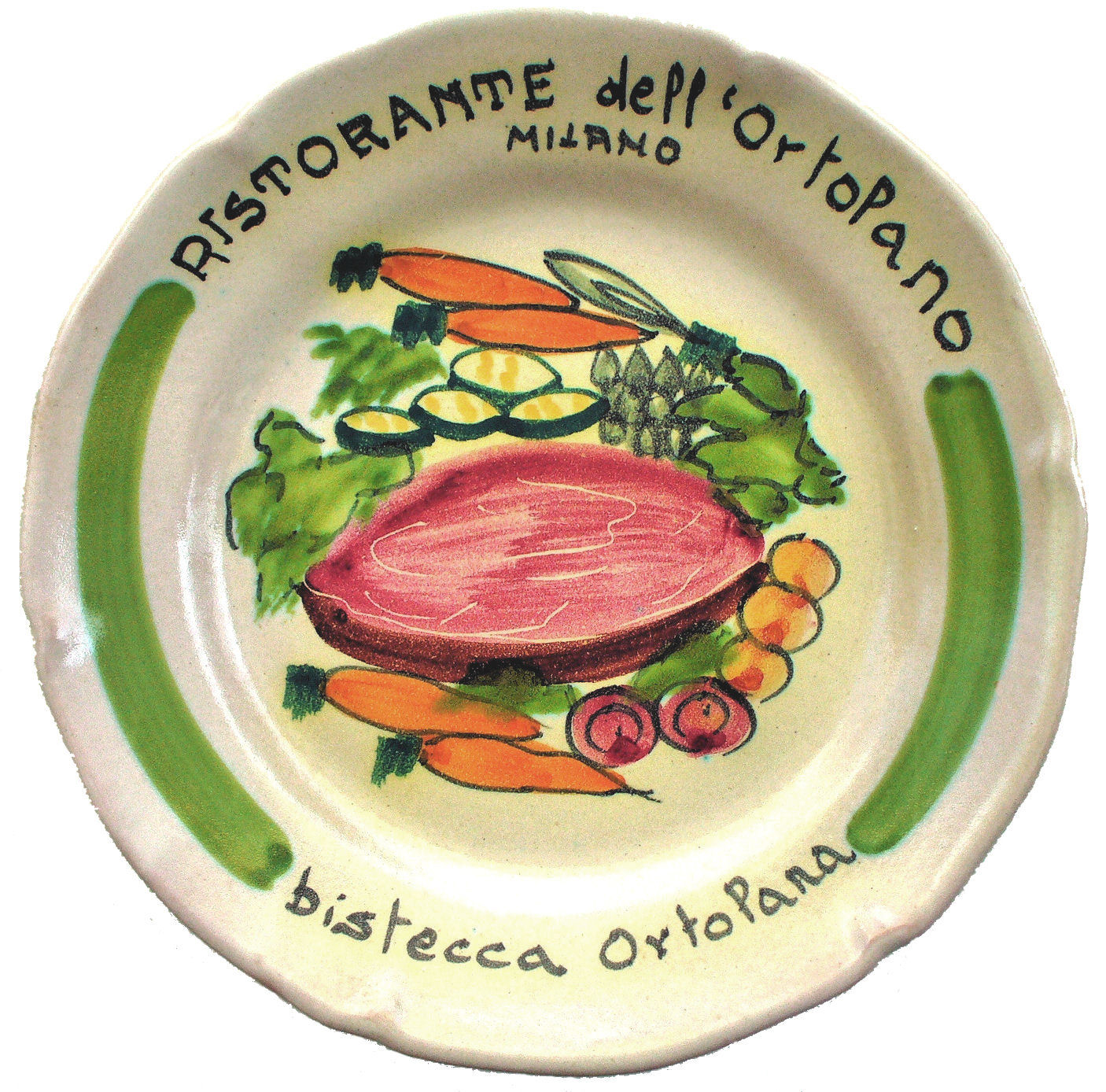 * Bistecca ortolana gen. 68 - giu. 69 Il piatto di presentazione riporta la scritta RISTORANTE dell'ORTOLANO, con verdura a foglie per lo più appuntite e contornate in grigio o nero - da 9 a 14 cipolle grigie. E' riconosciuta anche una variante di presentazione con scritta dell'Ortolano in minuscolo. Poi la scritta diventa RISTORANTE l'ORTOLANO e la verdura è semplificata (prima con timbro CAM e poi con i timbri 2C e 3D).