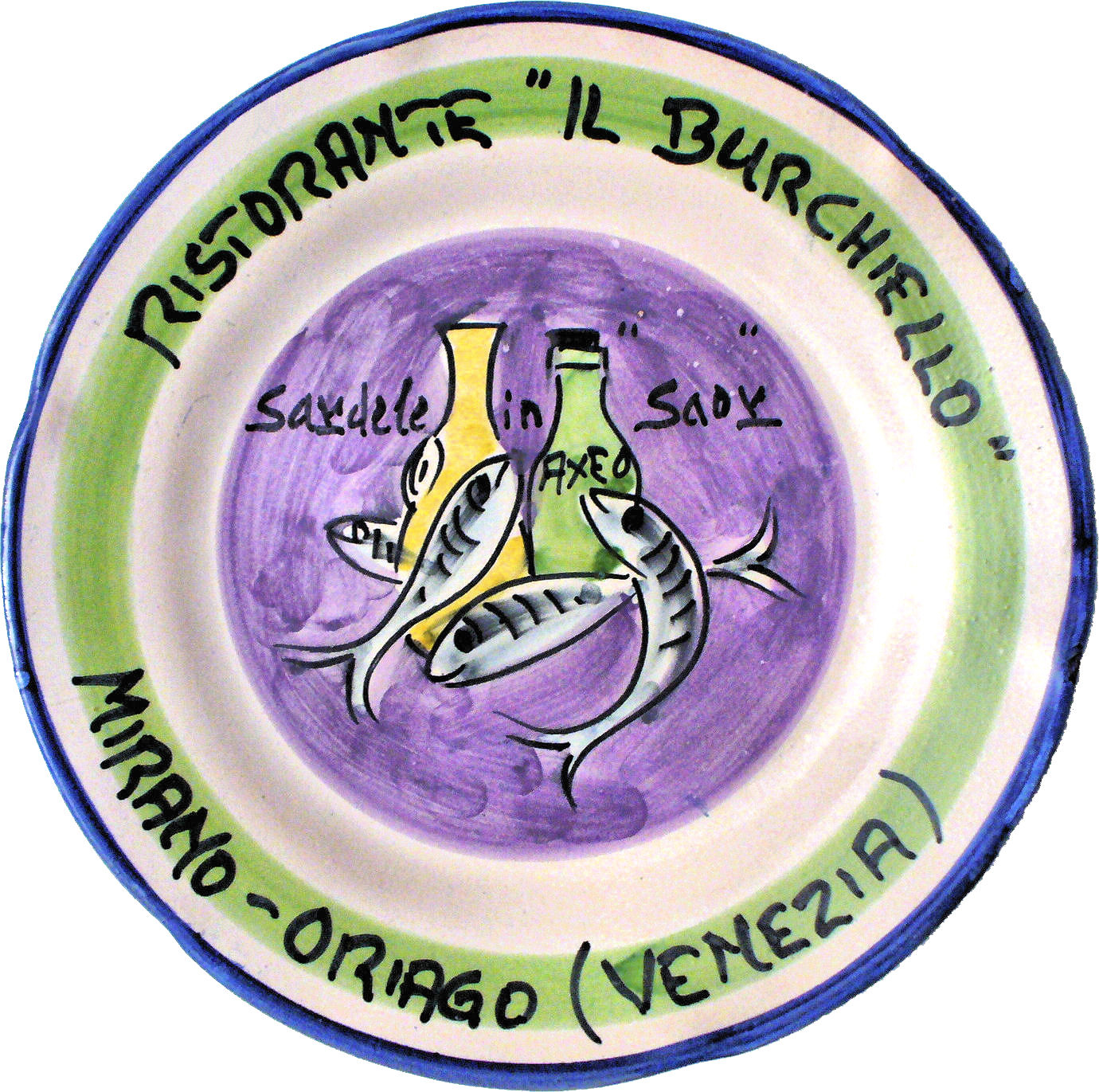 * Sepoline a la veneziana nov. 75 - giu. 94 I piatti di presentazione, con timbro 11G, hanno le seppie bianche, l'isola è marrone e la fascia è di colore seppia. Seguono poi numerose varianti: > uguale alla presentazione, ma fascia di colore verde (timbro 9G) > con seppioline nere, cupole senza croci (timbro 10G) > con scritta specialità su 2 righe, 2 seppie nere (anno '78) > con corpo visibile delle seppie (anno '79) > con fascia verde, isola nera > con scritta RISTORANTE DALL'AMELIA (anno '89) > gondola con prua gigante, seppie con teste grandi con 5 tentacoli (anno '91) |