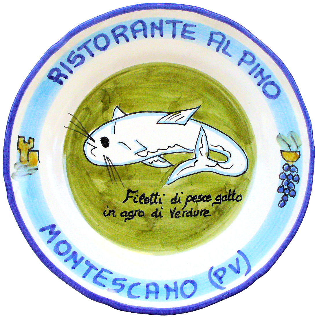 * Filetti di pesce gatto in agro di verdure mar. 95 - gen. 02 Nei piatti di presentazione le colline sono tonde e la torre è piccola, successivamente le colline sono aguzze. Dal 1997 con le emissioni della nuova ceramica, la torre è più grande e il grappolo ha più acini ed è con un vaso anziché con le colline, la scritta specialità è su 2 righe diritte.
